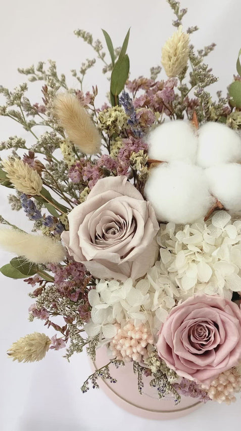 Featuring preserved roses, cotton, hydrangea, other foliage and filler flowers. This regular size bloom box comes in a pastel muted tone.
